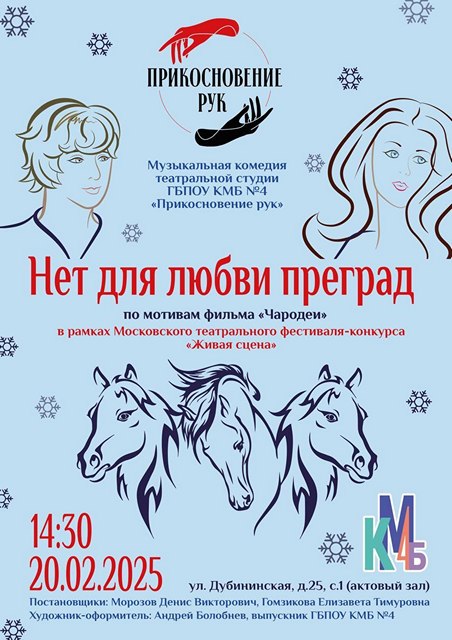 Не успели посмотреть новый спектакль нашей театральной студии «Прикосновение рук»? Хотим вас обрадовать: это можно сделать в четверг, в 14.30, в актовом зале главного корпуса! Музыкальная комедия «Нет для любви преград» будет показана в рамках Московского театрального фестиваля-конкурса «Живая сцена».
